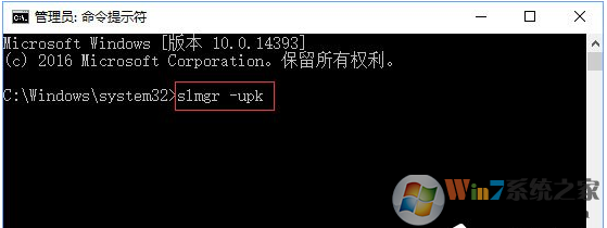 2、在命令指示符框中输入:slmgr -upk,回车(不管原来有没有激活码先清空再说);