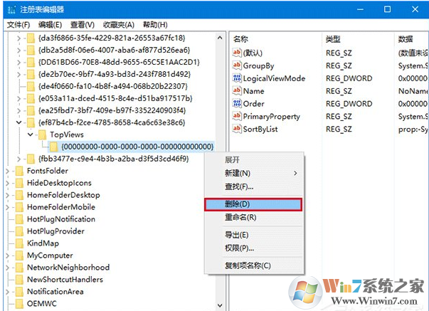3、在{00000000-0000-0000-0000-000000000000}上单击右键,选择“删除”;