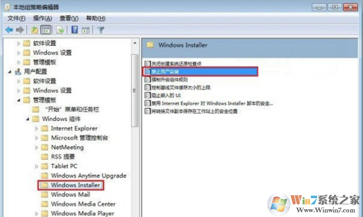 2、打开Win10本地组策略编辑器,然后逐一展开下面的选项“计算机配置、管理模板、Windows组件、WindowsInstaller,接着就找到右边的【禁止用户安装】选项,如图所示: