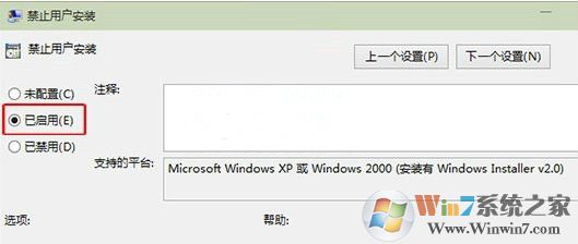 3、左键双击“禁止用户安装”选项,直接打开配置,接着把禁止用户安装配置勾选为“已启用”状态,最后再点击最下面的“确定”保存就可以了,如下图所示: