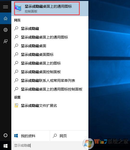 1、在搜索框搜索“显示或隐藏桌面上的通用图标”然后点击搜索结果即可。