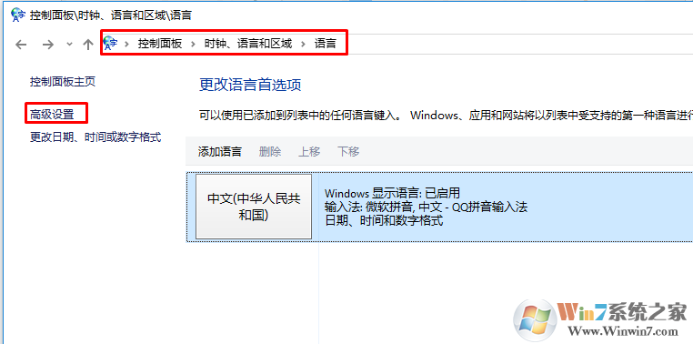 按Win+X—控制面板—时钟、语言和区域—语言—高级设置,