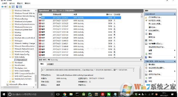 2.在左侧菜单选择 应用程序和服务日至 -> Microsoft -> Windows -> WMI-Activity -> Operational,双击一条错误信息