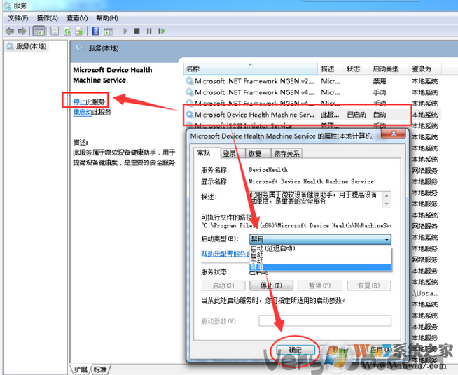 2、在服务界面找到【Microsoft Device Health Machine Service(DhMachineSvc)】服务,双击打开【Microsoft Device Health Machine Service(DhMachineSvc)】,将其启动类型修改为 禁用,点击应用 - 停止 - 确定即可!