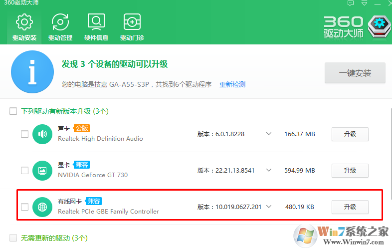 安装驱动的方法:可以根据自己的网卡型号去网上搜索最新的驱动,如果不知道自己网卡的型号,或者找不到合适的网卡驱动。可以使用360驱动大师解决此问题,然后按一键处理自动安装。