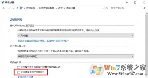 9、依次打开“时钟语言和区域—语言—高级设置”,勾选“使用桌面语言栏”。
