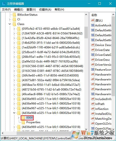 2、在注册表左侧依次展开:HKEY_LOCAL_MACHINE\SYSTEM\ControlSet001\Control\Class\{4D36E968-E325-11CE-BFC1-08002BE10318}\0000 ;