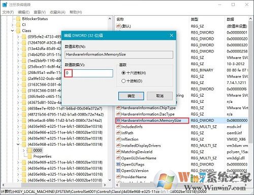 3、在右侧双击打开“HardwareInformation.MemorySize”,将其数值数据修改为“0”点击确定即可。