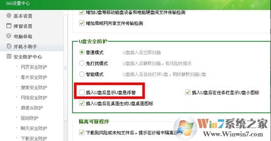 4、进入360U盘保镖设置界面。界面会自动停留在U盘安全界面上,我们将勾选界面中的”插入U盘后显示悬浮框“前面的对号给去掉,就可以了。此时360整个U盘安全系统都不会在显示这个悬浮框了。