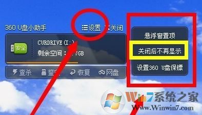 2、在悬浮框的X号旁边就是”设置“选项了,点击设置选项,会出现一列二级选项,用户选中其中的”关闭后不再显示“即可再去点击X号,这样以后就不会在出现这个悬浮框了。这个方法可以彻底解决问题。