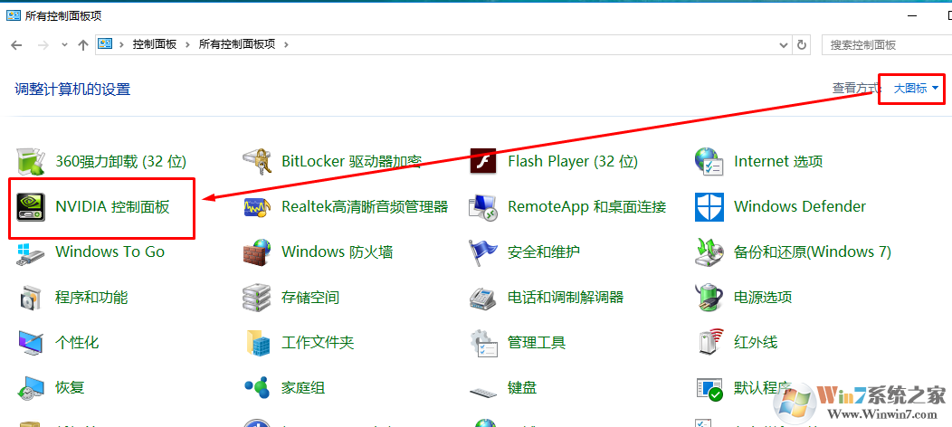这时候我们就得从控制面板中进入nvidia控制面板了。选择大图标----nvidia控制面板