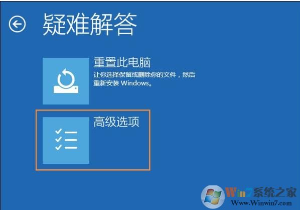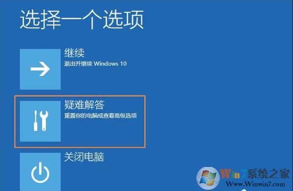 2、重复上述操作2到3次后系统会出现“选择一个选项”界面,我们点击其中的“疑难解答”选项;