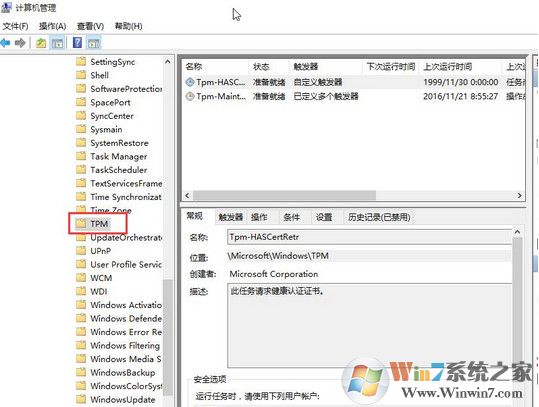 2、在界面中,依次展开:任务计划程序\任务计划程序库\microsoft\windows\tpm,如图所示: