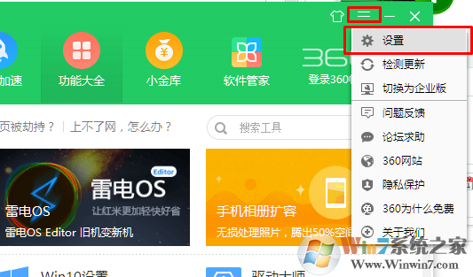 1、打开360安全卫士主界面选着设置。