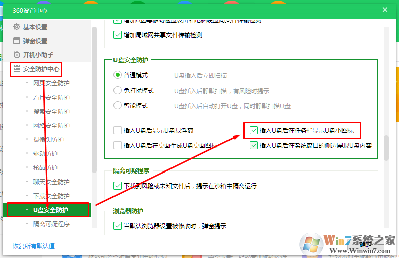 2、安全防护中心---U盘防护---勾选插入U盘后在任务栏显示U盘小图标。