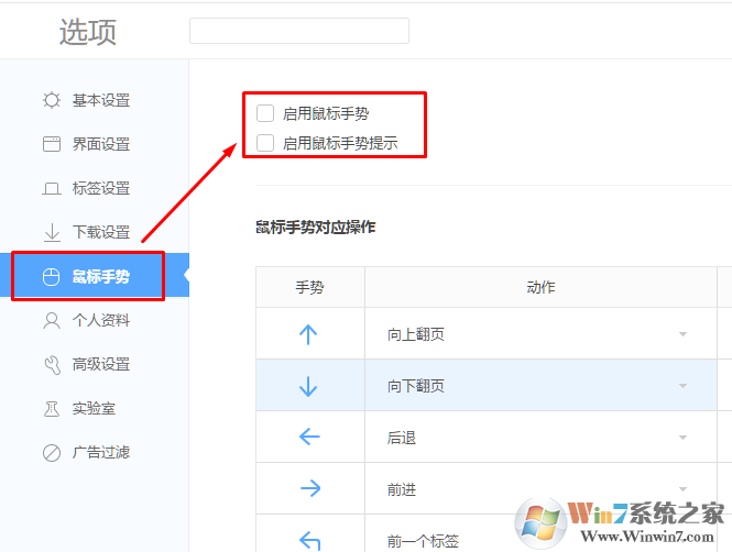 2、拉到最下方选择高级选项,我们就可以看见鼠标手势了,同样的取消勾选即可。