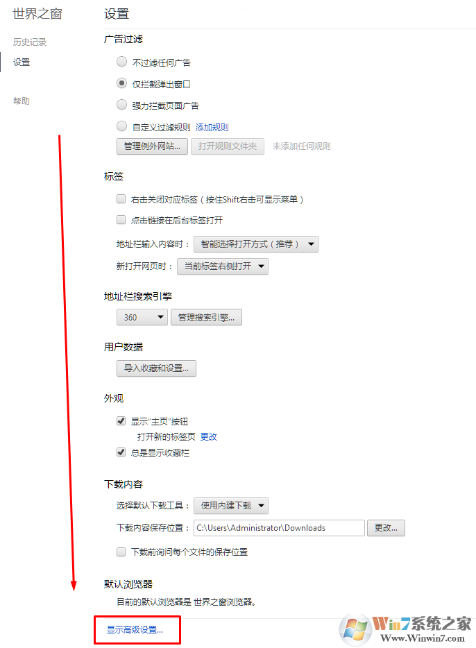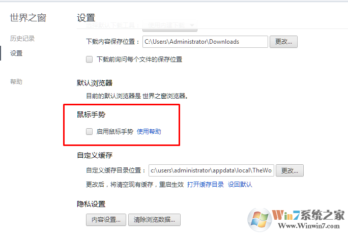还有一个问题就是很多用户表示找不到鼠标手势这一项,其实不是没有只是藏的比较深罢了。下面以世界之窗浏览器为例子为大家举列说明。