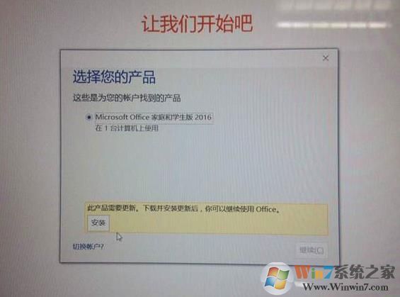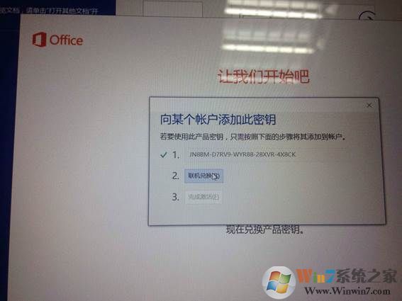 3、 弹出向某个账户添加密钥,默认第一步已经完成,证明已经识别到机器本身的序列号,我们只需点击下图中的第二步 “联机兑换”;(预装的OFfice2016是可以免费使用的)