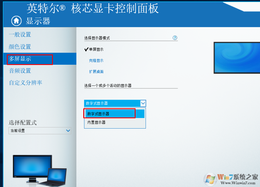4、在“多屏显示”里面可以选择“显示器模式”来切换外接显示器。或直接切换到数字显示器,内置为笔记本本身屏幕。
