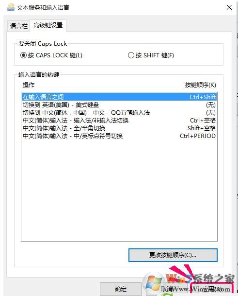 4、打开高级设置后找到第四分项[切换输入法],再点击[更改语言栏按键]