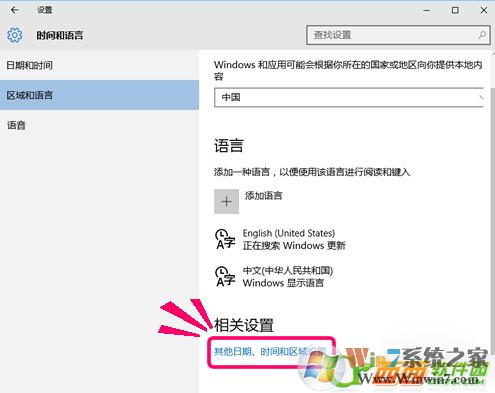 2、打开语言设置首选项后找到相关设置下面的[其他日期,时间和区域设置]