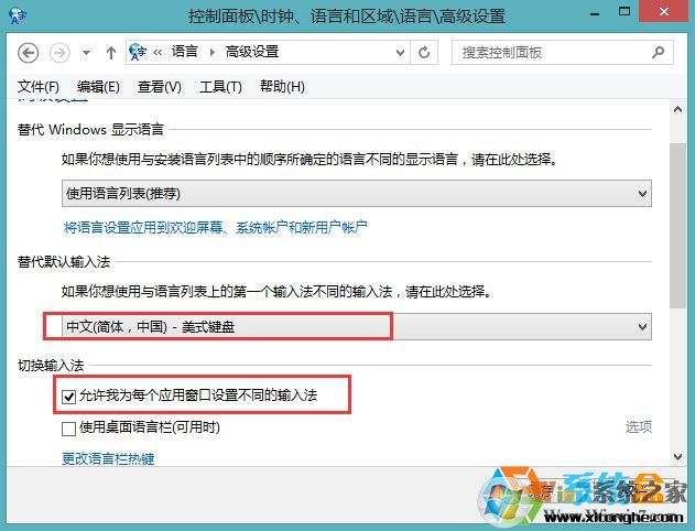 5、然后将替代默认输入法设置为“中文(简体中文)-美式键盘”,并勾选“允许我为每个应用窗口设置不同的输入法”;