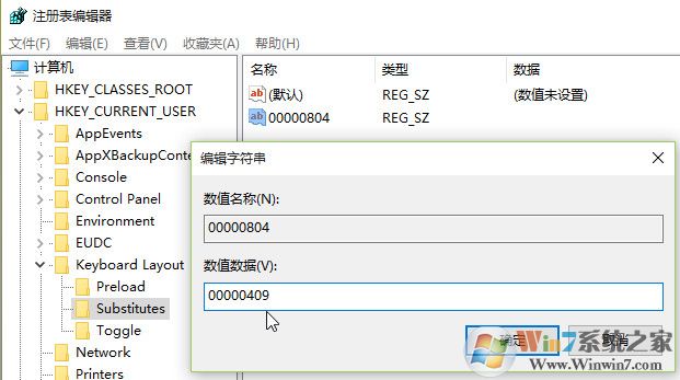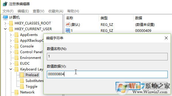6、打开注册编辑器:HKEY_CURRENT_USERKeyboardLayoutPreload,修改“1”的键值为“00000804”,然后在Substitutes项中新建字符串值,名称为“00000804”,键值为“00000409”,关闭注册编辑器,注销后重新登录。