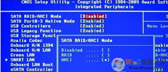 5、在“Integrated Peripherals”页面中,将“SATA RAID/AHCI Mode”更改为“AHCI”如下图所示: