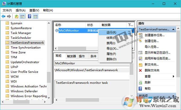 2、在计算机管理的系统工具——任务计划程序——任务计划程序库——Microsoft——Windows中找到TextServicesFramework,如下图所示,在右侧可以看到名为MsCtfMonitor的任务计划程序,右键单击MsCtfMonitor,选择“运行”即可。
