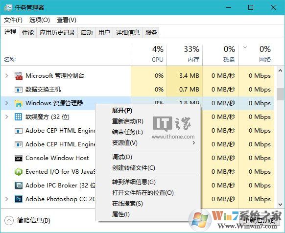 你可以在任务管理器中找到资源管理器,右键单击选择“重新启动”,如下图所示: