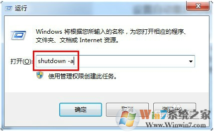 3、取消自动关机命令也很简单, 同样用快捷键“win+R”,在命令窗输入“shutdown -a”后单击“确定”即可马上取消自动关机任务。