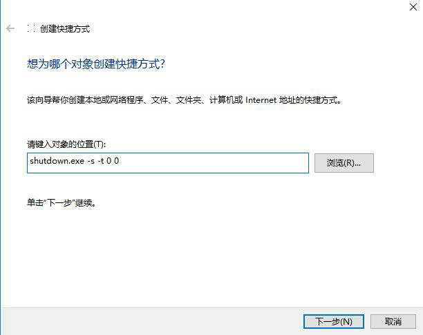 在对象处,输入"shutdown.exe -s -t 0 0"(此为数字0非字母o),并将其改为"关机.exe"。