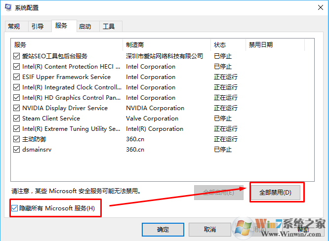切换到“服务”标签页,单击“隐藏所有Microsoft”服务,然后单击全部禁用。