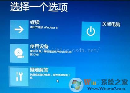 按住Shift不放 ,点开始菜单,选择重启,过一会进入如下界面(网上的图片,WIN10差不多),选择 “疑难解答”: