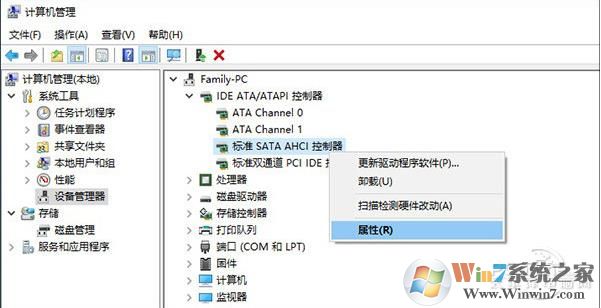 2. 展开节点“IDE ATA/ATAPI控制器”→“标准SATA AHCI控制器”,右击选择“属性”;