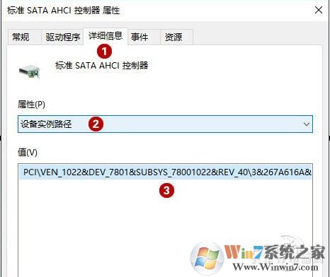 3. 点击“详细信息”标签,将“属性”栏修改为“设备实例路径”,记录下它的路径;