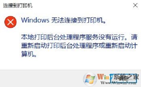 Windows 10 系统在使用打印机时,提示 Windows 无法连接到打印机,“本地打印后台处理程序服务没有运行。请重新启动打印后台处理程序或重新启动计算机”,如图: