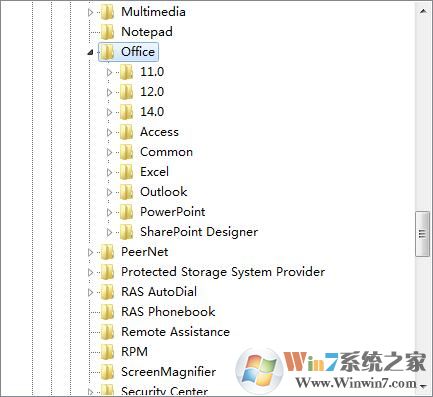 2、在注册表左侧菜单一次展开:HKEY_CURRENT_USER\Software\Microsoft\Office ,如图: