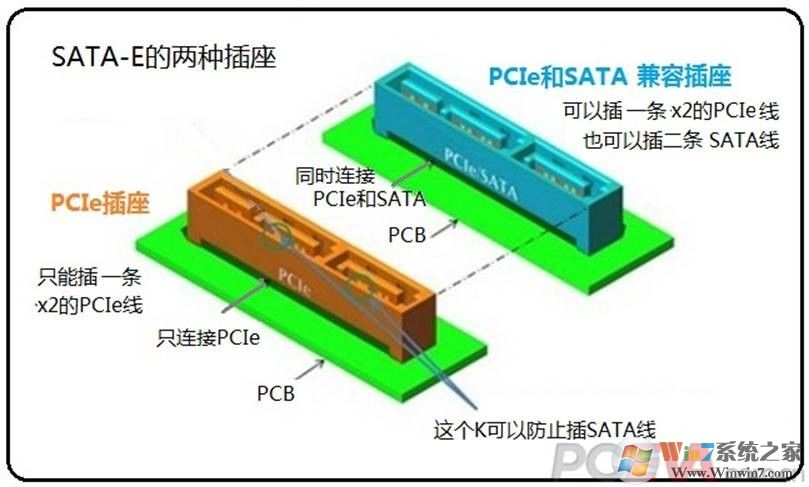 当前主板上的SATA-E接口为了和SATA兼容,基本上都采用PCIE和SATA兼容的插座。