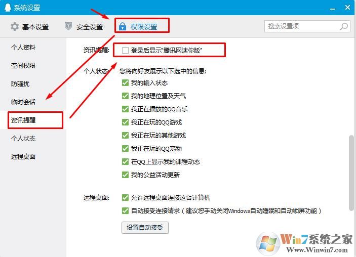 2、打开设置面板之后,我们点击上面的【权限设置】,然后在左侧点击【资讯提醒】,并在右侧找到“登录后显示“腾讯网迷你版””取消勾选;