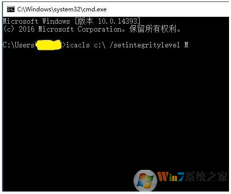 2、在命令提示符中输入:icacls c:\ /setintegritylevel M 按回车键后等1分钟,会出现“已成功处理一个文件”;