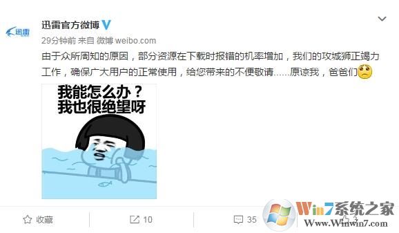 10月16号,迅雷官方微博回应称:“由于众所周知的原因,部分资源在下载时报错的机率增加,我们的攻城狮正竭力工作,确保广大用户的正常使用,给您带来的不便敬请……原谅我,爸爸们”