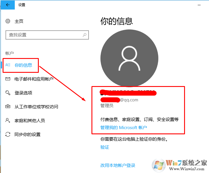 2、选择账户,在你的信息中改用微软账户登录。