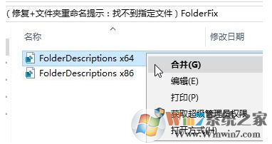 3、按自己系统的位数选择注册表文件,单击右键,选择【合并】,在弹出的框中点击【是】即可。(win10 64位系统使用FolderDescriptions x64,win10 32位系统使用FolderDescriptions x86)。