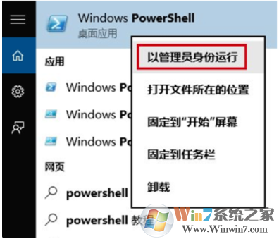 1、在Cortana搜索栏输入PowerShell后,在第一项点击右键,选择“以管理员身份运行”,如下图