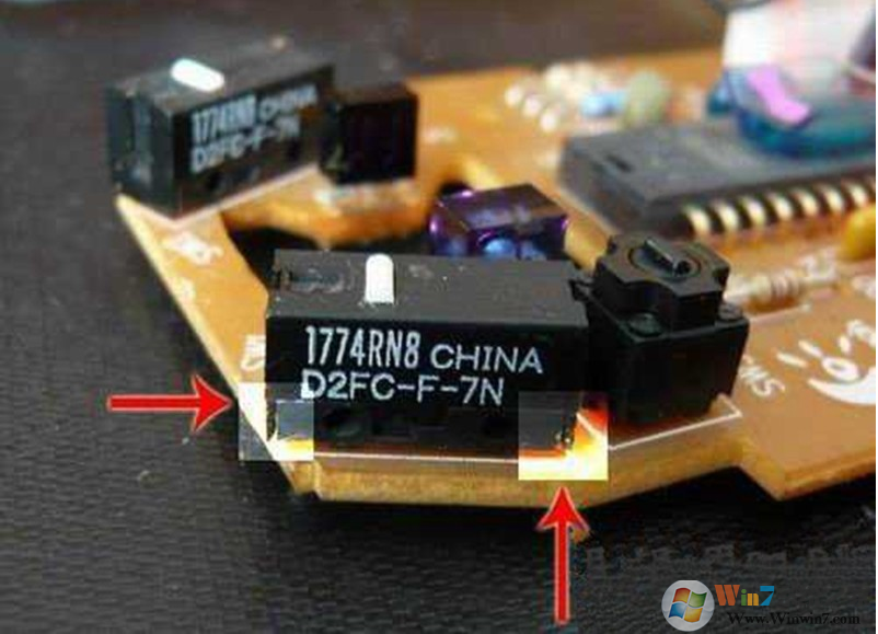 这里是关键点了。如果鼠标的按键失灵,或者单击变双击,那么图中圆圈处的白色条块应该会变成灰色或者黑色(被氧化了),用一字螺丝刀,或者小金属片之类的刮几下,让它恢复原来的亮白色即可。