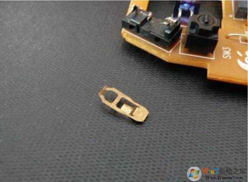 拆下的金属片。(如果发现微动开关外壳或这个金属片已经完全损坏,那就只有更换新的微动开关了,这个需要电烙铁才能更换。如果你的鼠标本来就很便宜的话建议直接换新鼠标,反之,可以拿到维修店去,让维修师傅给你换,一般一、二十元就搞定了)