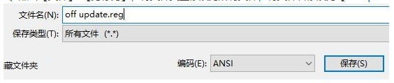 3、点击【文件】-【另存为】,将文件类型修改为所有文件,将文件名修改为【off update.reg】 点击保存;