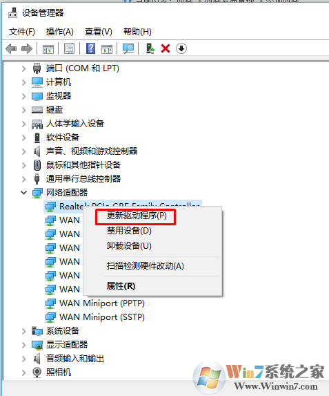 2、在网络适配器下找到无线网卡,右键选择更新驱动程序即可。