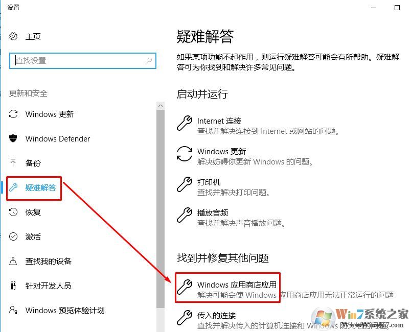 2、打开疑难解答后点击右侧应用商店应用下的疑难解答,按照操作修复即可。